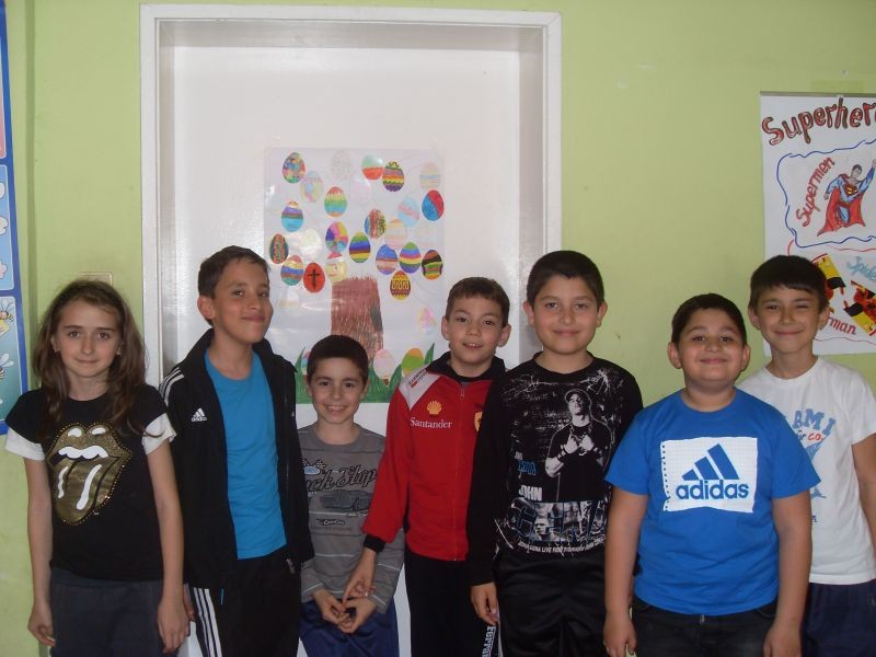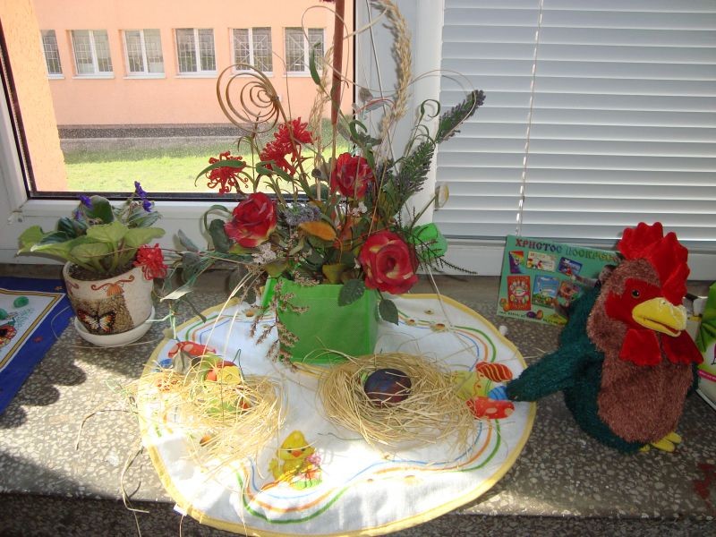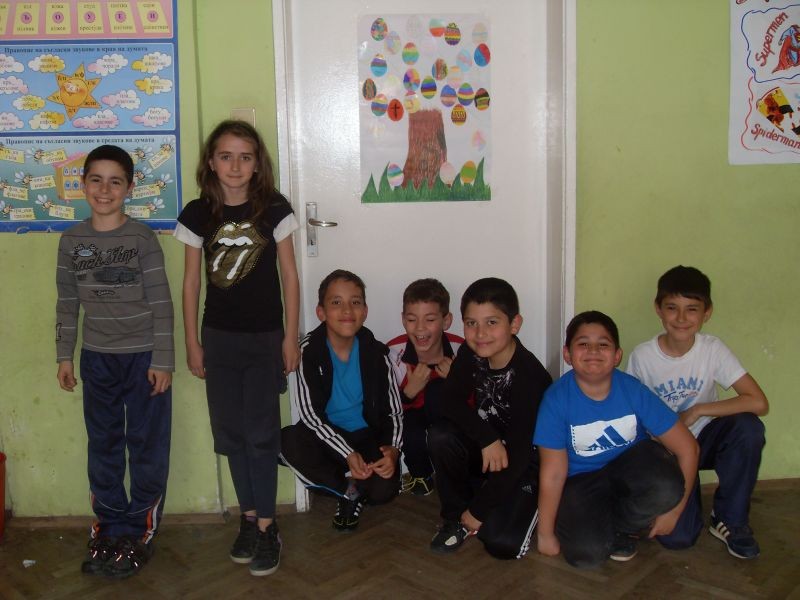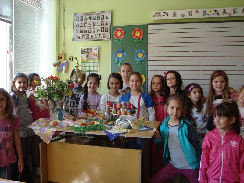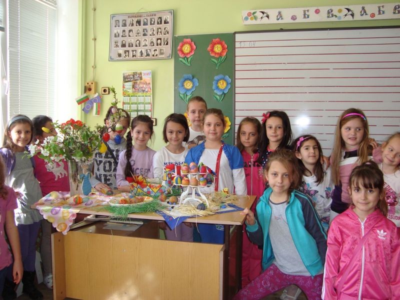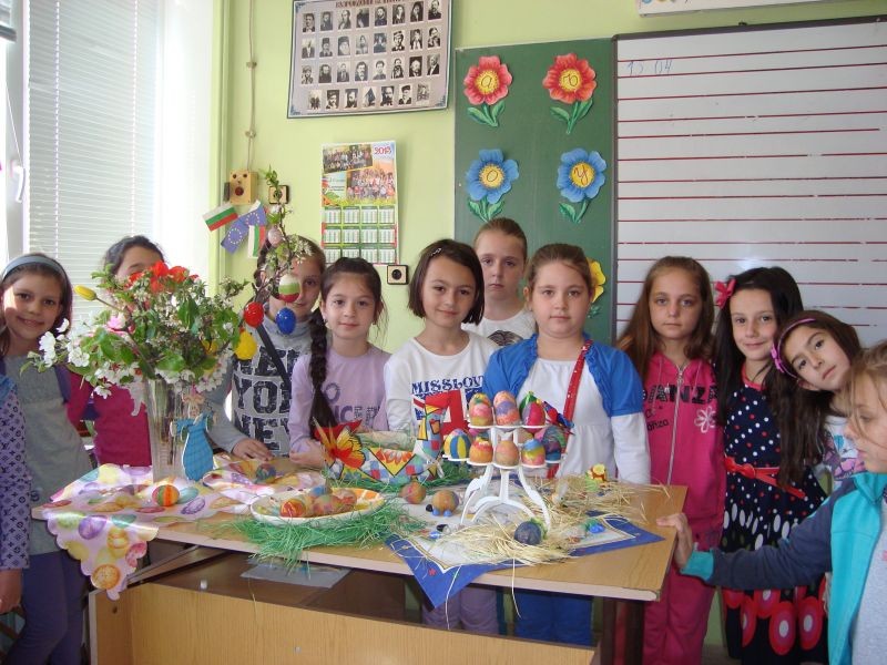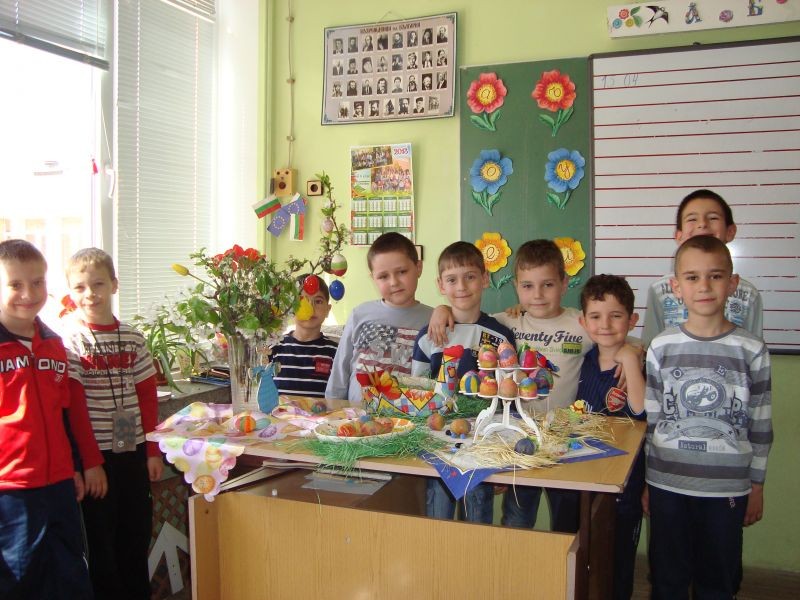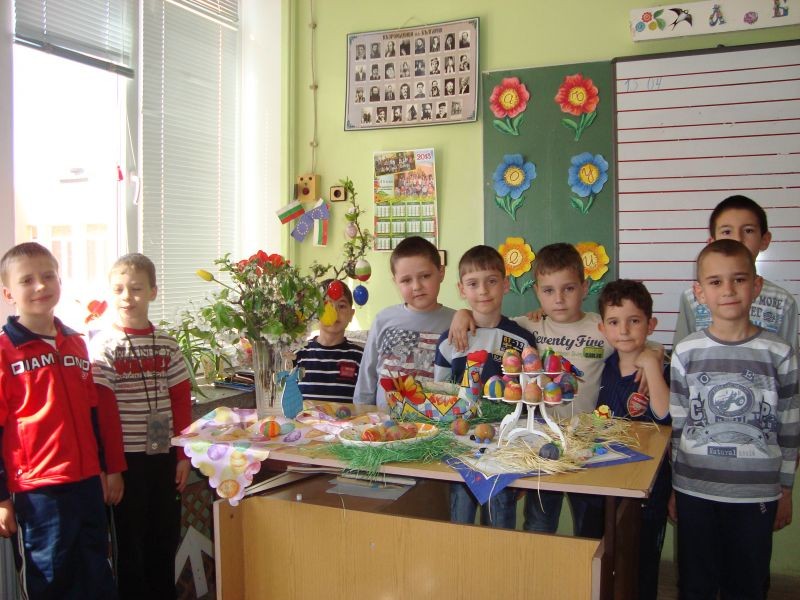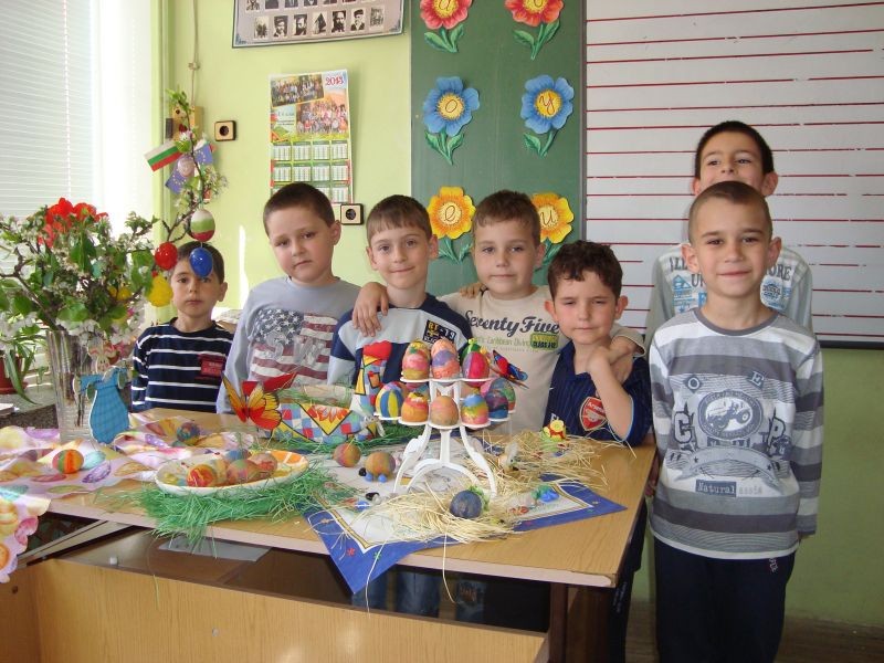 За големия християнски празник „Великден” учениците от начален етап с много любов, старание и сръчност в часовете по интереси следобед с помощта на възпитателките изготвиха красиви картички и подредиха изложба с великденски яйца.