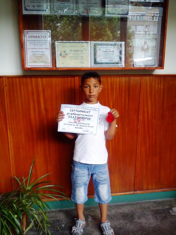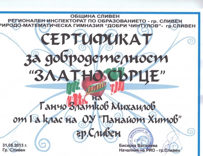 По инициатива на Община Сливен, РИО - Сливен и ПМГ"Добри Чинтулов" - Сливен през месец май бе организиран конкурс за добродетелност "Златно сърце". Ганчо Златков Михаилов - ученик от І"а" клас в от VІІ ОУ "Панайот Хитов" спечели СЕРТИФИКАТ ЗА ДОБРОДЕТЕЛНОСТ "ЗЛАТНО СЪРЦЕ". Първокласникът бе предложен за този конкурс от своята класна ръководителка - г-жа Мартиана Димова, заради изключителната му добронамереност и готовност за помощ към своите съученици.