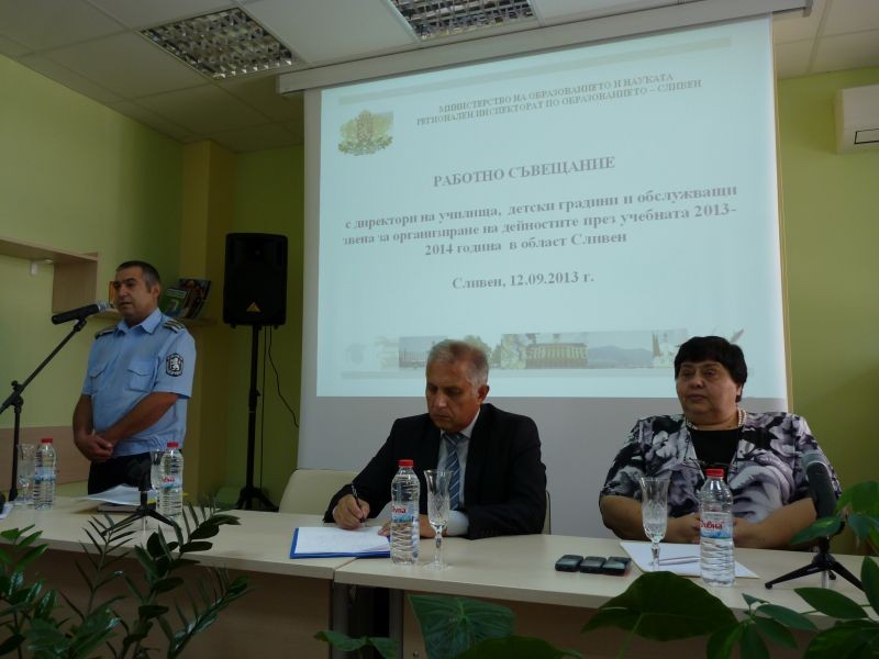 Гл. инсп. Добромир Добрев – началник на „Охранителна полиция“ при ОДМВР – Сливен, представи съвместен план за взаимодействие между РИО и ОДМВР относно безопасността на учениците в областта, както и правилата за реакция при злонамерени телефонни обаждания и практически препоръки за предотвратяване на пътнотранспортни произшествия с ученици.