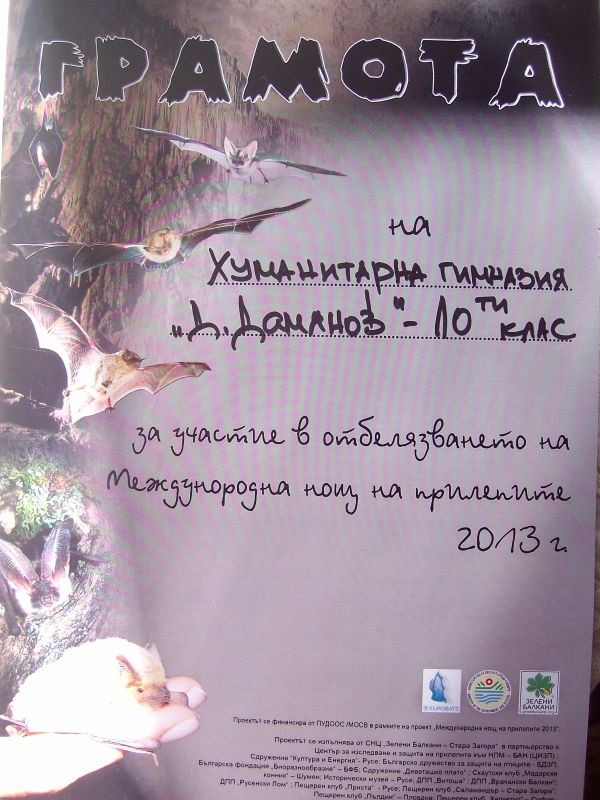 На 25.10. 2013 г. ученици от 10-ти клас при ХГ „Д. Дамянов” станаха участници в „Европейската нощ на прилепите 2013” състояла се в Градската градина. Инициативата е на група за опазване на пещерите и прилепите към Федерация на природозащитни сдружения „Зелени Балкани”. Отбелязана за първи път през 1990 г. във Франция и Полша, днес Европейската нощ на прилепите се организира в повече от 30 държави, сред които и България. През 2012 г., за първи път към събитието се присъединиха и САЩ, Филипините, Азербайджан, Израел, Тунис, Украйна и Ливан. С това Нощта на прилепите се превръща в международна проява, надхвърляща мащабите на Стария континент, която цели да запознае повече хора с уникалния начин на живот и голямата значимост на едни от най-интересните животни на планетата - прилепите. През 2013 г. България отбелязва Нощта на прилепите за 17-ти път.