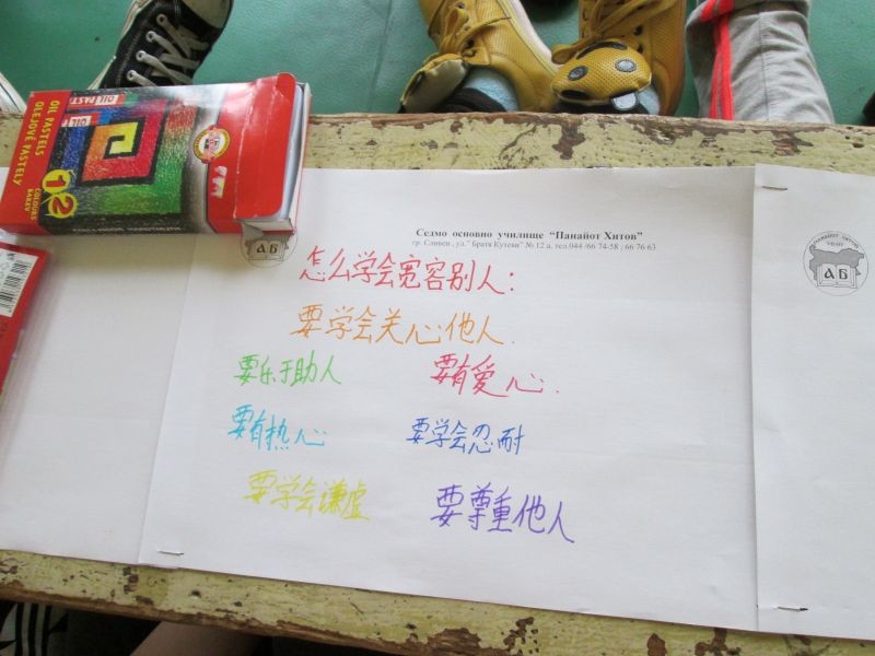 На една пейка във физкултурния салон на училището седнаха ученици от различни етноси и показаха на нас, възрастните, как да бъдем толерантни. Децата изработиха оригинални рисунки, послания, есета за толерантността.