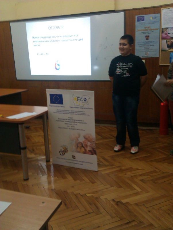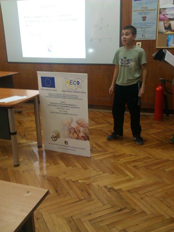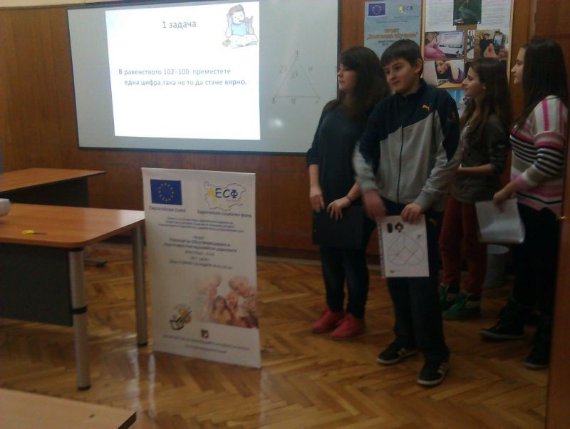 На 16.01.2014 год. в един от мултимедийните кабинети на училището се проведе първата представителна изява на клуб „ Полезна и забавна математика”, с ръководител Йорданка Неделчева.Гостите с интерес научиха интересни суеверия за числа и геометрични фигури, наблюдаваха математически фокуси.Всички се забавляваха с веселите истории и анекдоти, посветени на математиката. Особено интересни се оказаха задачите, включени във викторината.