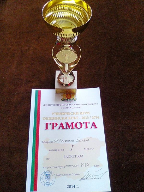 На 02. 02. 2014 г. в спортна зала " Васил Левски" от 12.30 ч. се състоя церемония по тържествено награждаване на отборите, заели призови места в Общински кръг на ученическите игри. Баскетболният отбор при XII ОУ " Елисавета Багряна" бе отличен с първото място във възрастова група- момичета до VII клас. Като най-добър отбор, момичетата получиха грамота и златна купа за прекрасното си представяне лично от инж. К. Милев- кмет на община Сливен.