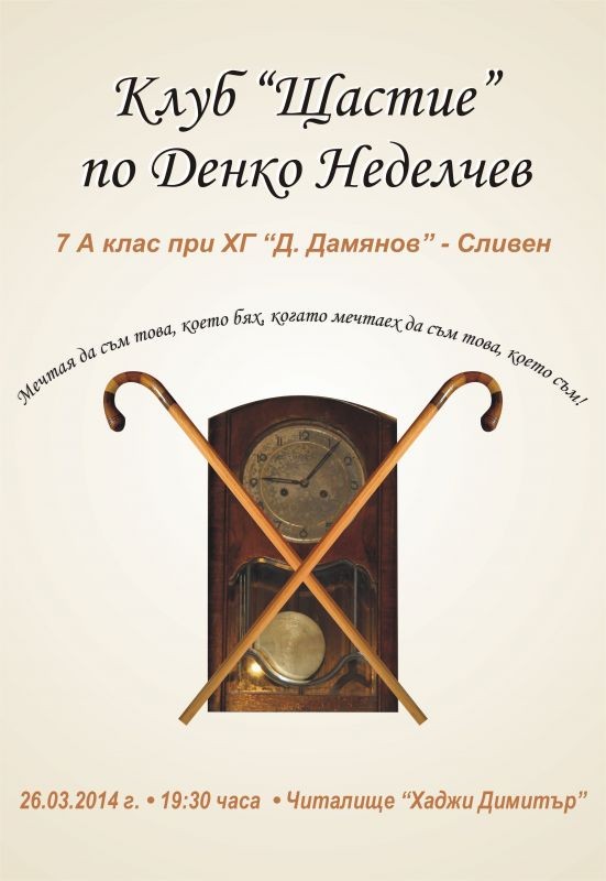 7а клас при Хуманитарна гимназия, канят всички любители на театъра на тяхната постановка „Клуб Щастие“, която ще се играе на 26.03.2014г. от 19,30 часа в читалище „Хаджи Димитър“/в близост до 2-ро ОУ „Хр. Ботев“/.