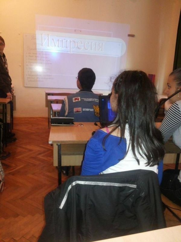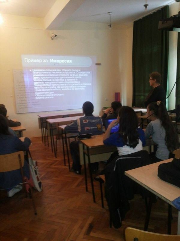На 25.04.2014 г се състоя поредното занятие по проект „Успех“ на тема: „Импресия. Изисквания за писане“. Учениците от секция „Вълшебният свят на словото“ подготвиха презентация: „Импресия. Видни импресионисти.“ Учениците се запознаха както с примерни авторски импресии, така и с успехи на ученици в този жанр. В презентацията бяха предложени разнообразни пейзажи с цел отключване емоциите на учениците за писане на импресия.
