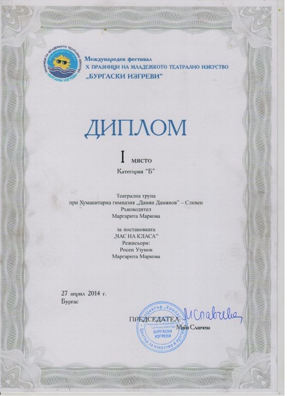 Сред талантливите актьори бяха отличени Калина Митева - 9а клас, която изигра Хейти и Ивета Стоянова – 8а клас в ролята на Очите. Изпълнението на Ивета остави журито разплакано и очаровано! Но трупата не си тръгна само с тези награди. Тя взе и награда „За високи постижения като постановъчен екип”- Маргарита Маркова и Росен Узунов. Разбира се, театралната трупа използва времето си в Бургас и за да обогати знанията си. Театралите посетиха къщата – музей на Петя Дубарова и научиха повече за живота и ранната смърт на тази талантлива поетеса. Темата за самоубийството е основна в постановката „Час на класа”, а “учениците от този клас” успяха да защитят тезата „Самоубийството не е решение”.