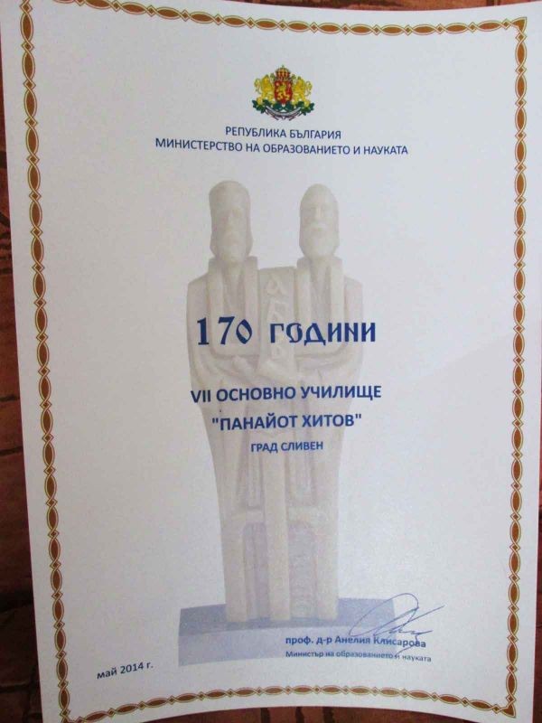 В навечерието на 24 май - най-светлия празник на българската духовност и култура, ОУ „Панайот Хитов“ получи награда от Министерството на образованието и науката - почетно отличие и статуетка "Св.св. Кирил и Методий", във връзка с отбелязването на 170 години от основаването си.