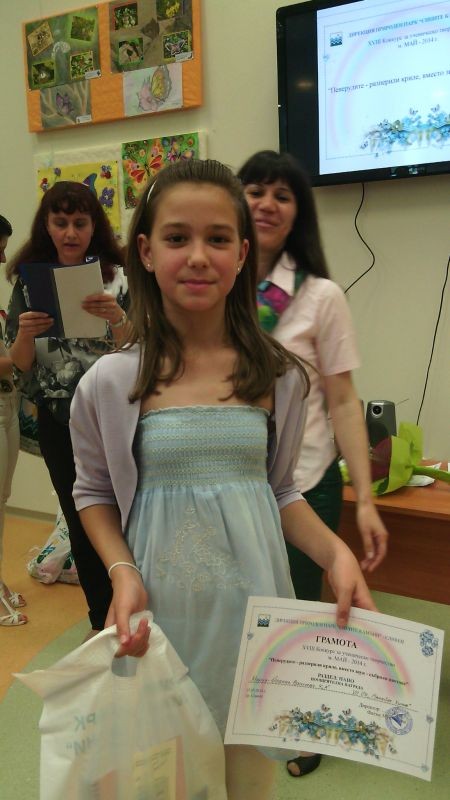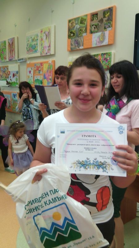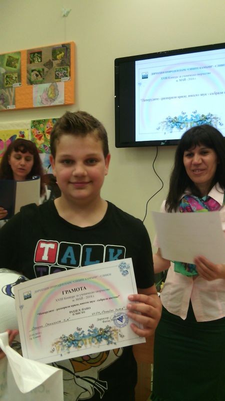 На 27.05.2014 година на официална церемония в новооткритата сграда на Природен парк "Сини камъни" се проведе награждаване на участниците в конкурса "Пеперудите разперили криле, вместо звук - събрали цветове". Отново имаме повод за радост - във втора възрастова група от V-VIII клас в раздел "Пана" на второ място е Стелиян Стелиянов от Vб клас, а на трето място е Теодора Калчева, също от Vб клас. С поощрителни награди бяха отличени Мария-Йоанна Христова от IVа клас в раздел "Пана" и Преслава Александрова от Iа в раздел "Рисунка".