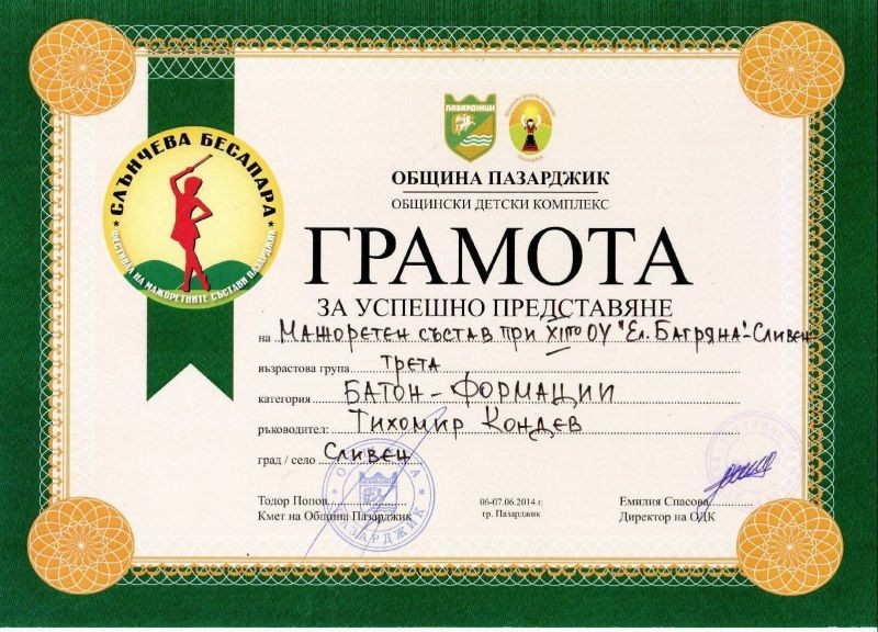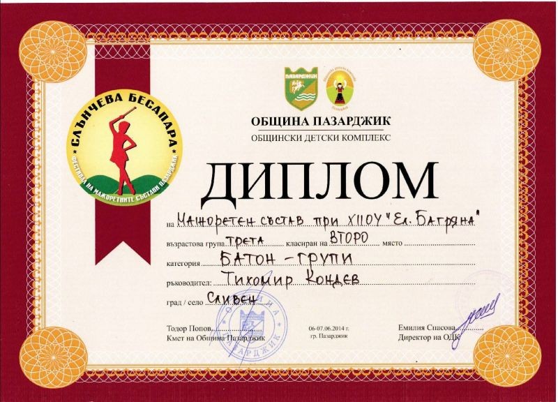 В тазгодишното четвърто издание на Фестивала на мажоретните състави «Слънчева Бесапара» 2014, провел се на 6 и 7 юни в Пазарджик се включиха 421 мажоретки от 15 градове: Пазарджик, Горна Оряховица, Правец, Ябланица, Панагюрище, Пловдив, Свиленград, Сливен, Симеоновград, Първомай, София, Своге, Сопот, Нови Пазар и Кнежа. В шеметна надпревара 16 мажоретни състава се състезаваха в три категории. Нашите момичета спечелиха следните места: