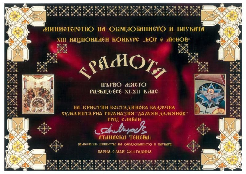 На 9 юни във Варна се проведе награждаването на лауреатите на националния конкурс „Бог е любов” на Министерството на образованието и науката, който се провежда вече 13 години. Тази година конкретната тема на ученическото творчество беше „Нашите небесни покровители”, а домакин на събитието бе Варненска и Великопреславска митрополия в сътрудничество с РИО – Варна. Ученици от цялата страна се събрахме в курорта „Св. Константин и Елена”, за да получим грамоти и специални награди, осигурени от Министерството на образованието.