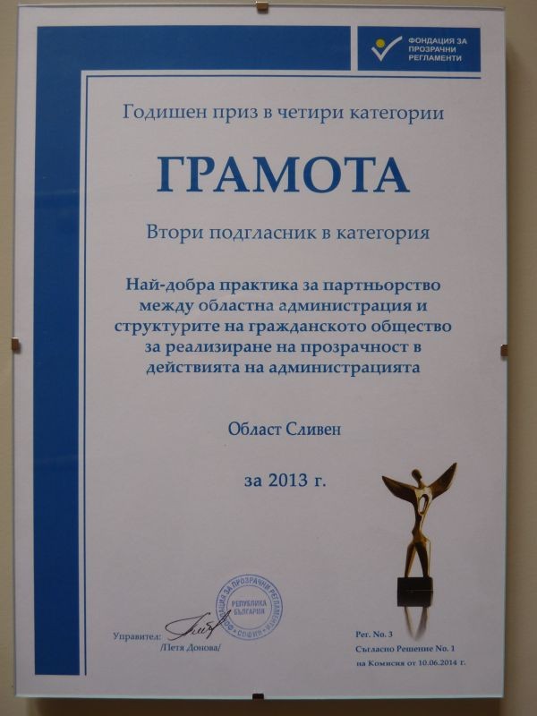 На 27.06.2014 г. на областният управител на област Сливен бе връчена грамота от Фондация за прозрачни регламенти. Призът връчи Петя Донова – директор на фондацията.
