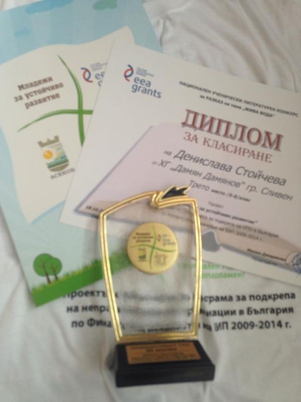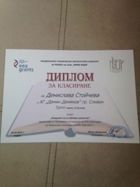 Денислава Стойчева - ученичка от Хуманитарна гимназия “Д. Дамянов“, получи трета награда (5-8 клас) от Национален ученически конкурс „Биоразнообразието на моя роден край - извор на гордост и вдъхновение“, част от проект „Младежи за устойчиво развитие“. Конкурсът се проведе в четири направления - литература, информационни технологии, изобразително изкуство и фотография. Денислава участва със своя разказ „Жива вода“ - един невероятен сън за силата на водата, извор на живот и здраве.