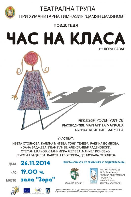 След реализирането и заснемането на превантивен филм за употребата на психо-активни вещества /ПАВ/, МКБППМН в партньорство с Хуманитарна гимназия „Дамян Дамянов” , има удоволствието да Ви покани на един различен “Час на класа” – пиеса от Лора Лазар на 26 ноември /сряда/ от 19.00 ч. в зала “Зора”.