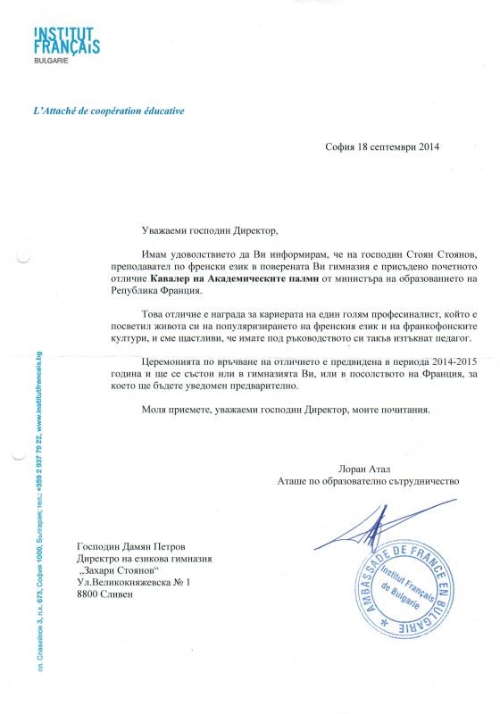 Министъра на образованието на Република Франция присъди почетно отличие Кавалер на Академическите палми на преподавателя по френски език Стоян Стоянов за неговия професионализъм и за популяризирането на френския език и франкофонските култури.
