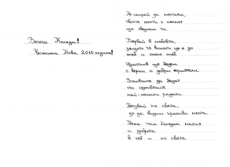 Поздравява всички свои приятели, всички ученици, родители, учители и служители с настъпващите празници с коледното пожелание на Василена Вълева, ученичка от 8а клас, спечелила първа награда в националния конкурс за най-оригинално послание: