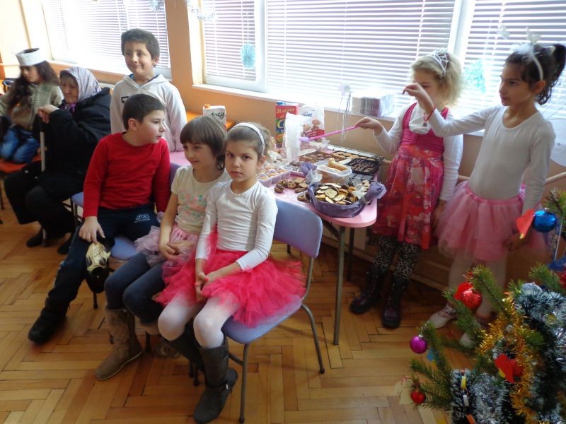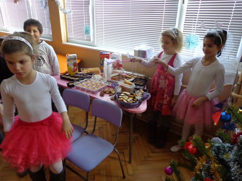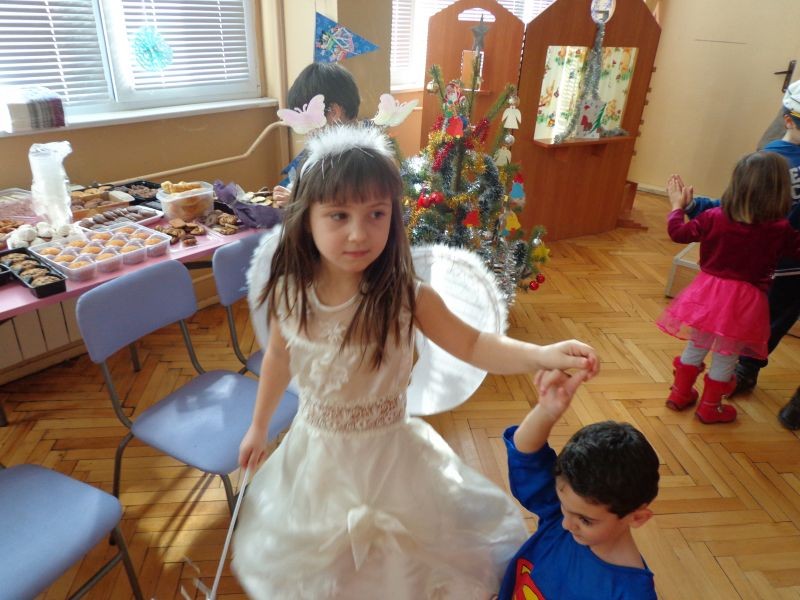 С музика, танци и песни около коледната елха първокласниците представиха свои любими герои от филми и приказки. С вълшебните си пръчици приказните феи създадоха много настроение и радост сред своите съученици.