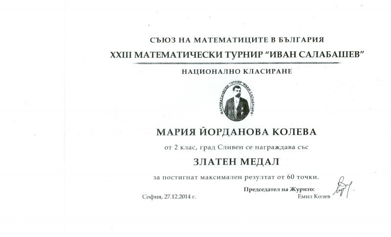 На 06.12.2014 г. над 1400 второкласници от цялата страна се състезаваха на XXIII математически турнир „Иван Салабашев”. Десет от тях са излъчени на първо място от Съюза на математиците в България и сред тях е и нашата Мария Йорданова Колева от II „в” клас. На 18.01.2015 г. в 11.30 ч. в института на БАН - гр. София победителите бяха наградени. Мария Йорданова Колева е удостоена със златен медал за постигнат максимален резултат от 60 точки.