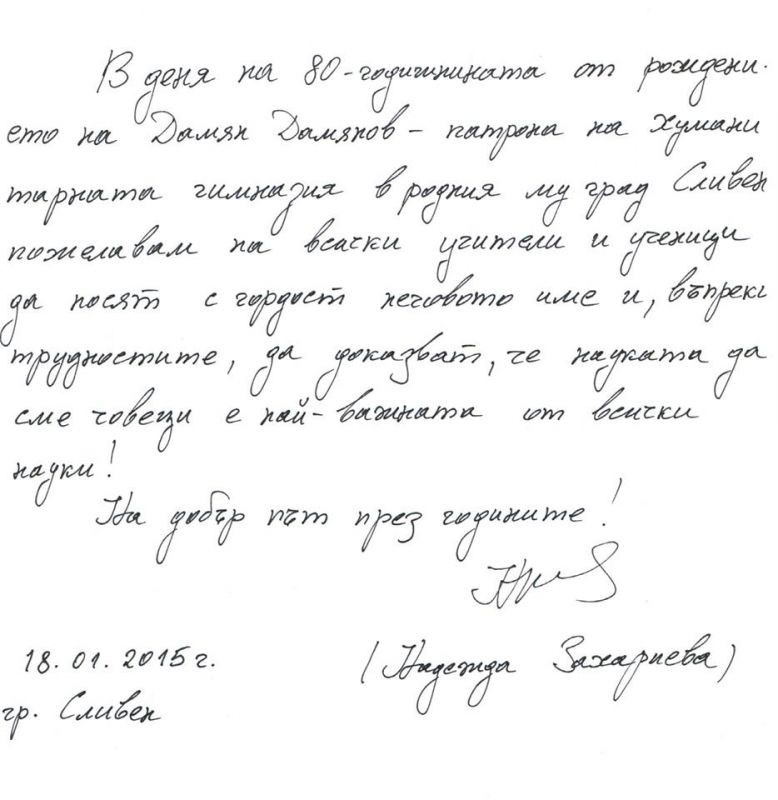 Надежда Захариева остави скъпи пожелания за учителите и учениците в Хуманитарна гимназия "Дамян Дамянов", отваряйки първите страници на Паметна книга на училището за почетните гости.