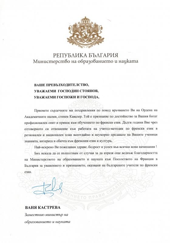 Г-н Стоян Стоянов - учител по френски език получи почетното отличие Кавалер на академическите палми