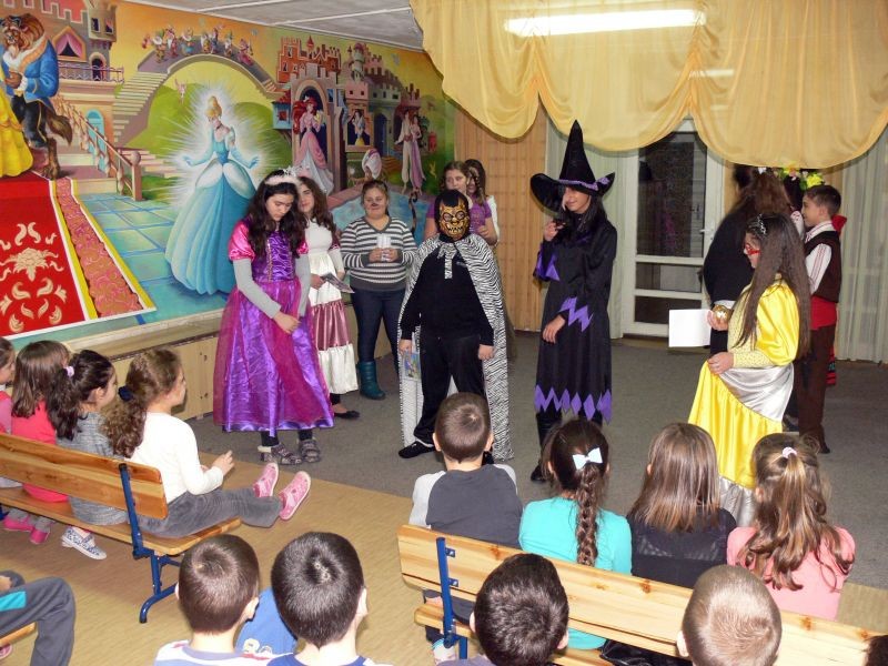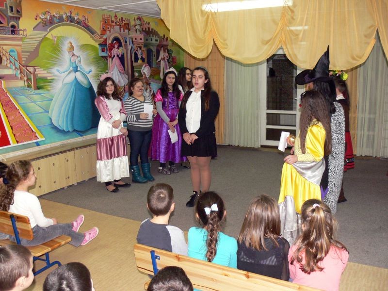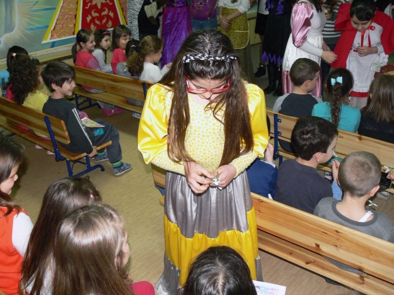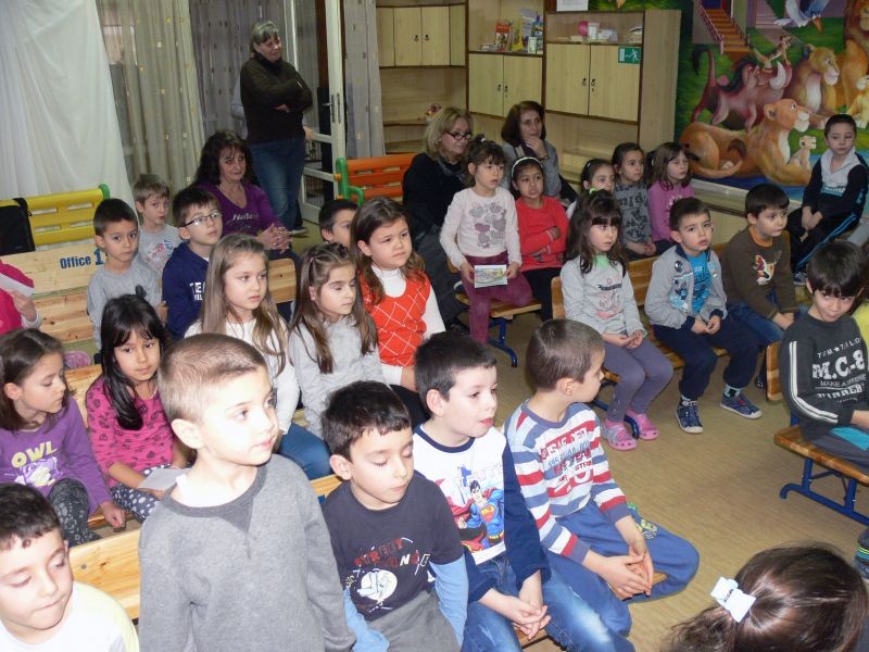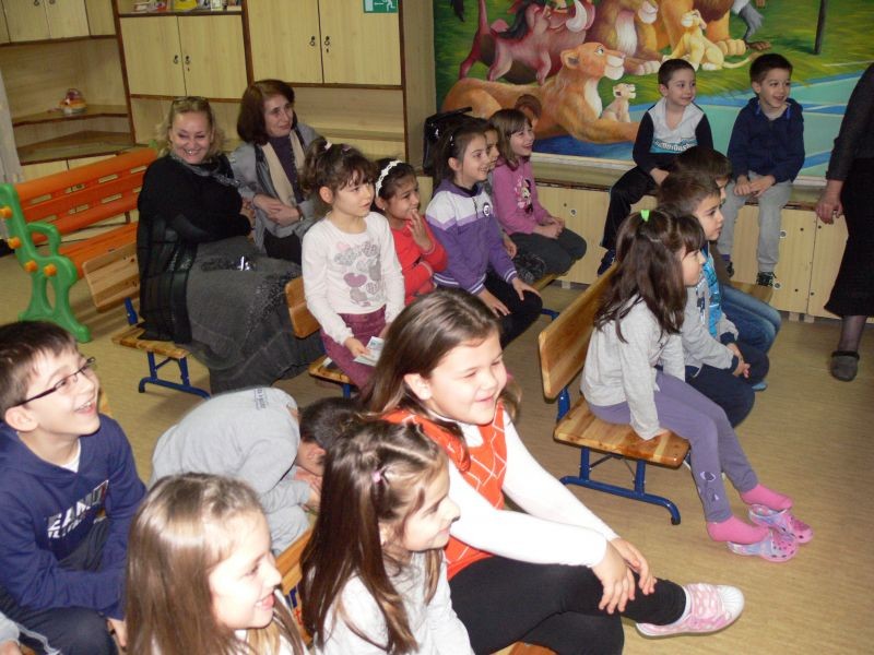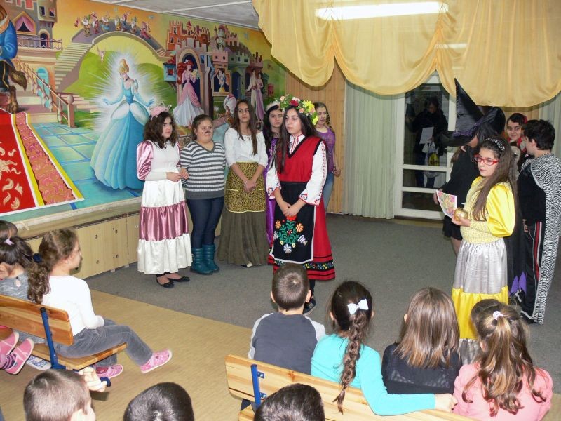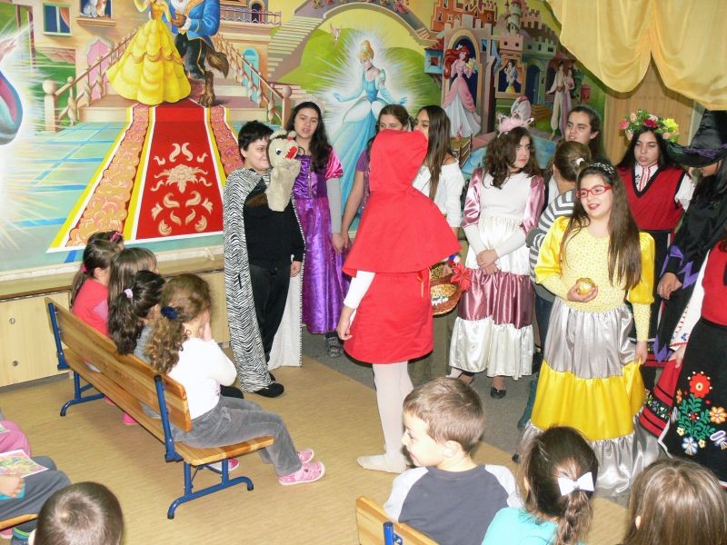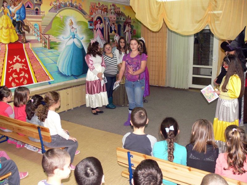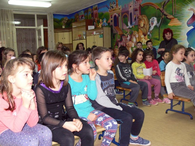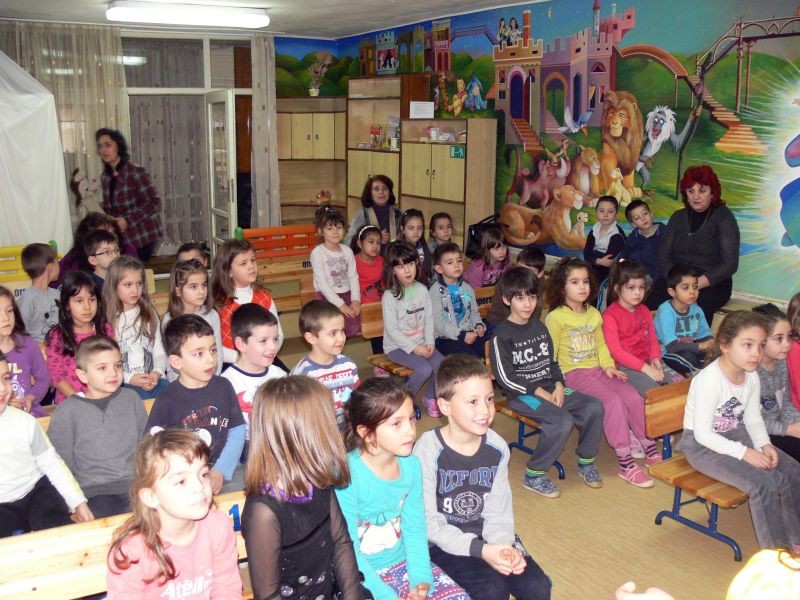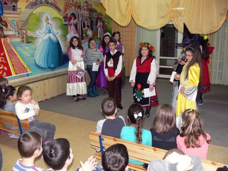 На 28 януари ентусиазираната театрална група бе посрещната много радушно от двете предучилищни групи. Много забавно, с викторина от приказни загадки в стихове и проза, младите „актьори” –петокласници от СОУ „Й. Йовков” провокираха детското въображение. Пред децата един след друг „ оживяваха” приказни герои като Пепеляшка и Красавицата от „Хубавка и чудовището”, Златната ябълка и Хитър Петър, Червената шапчица и Вълкът, седемте козлета и Пипи Дългото чорапче...
