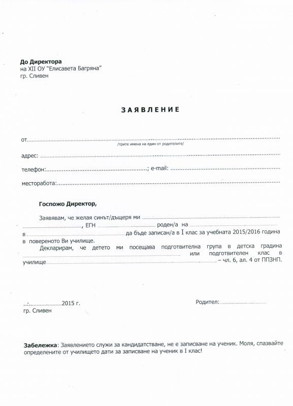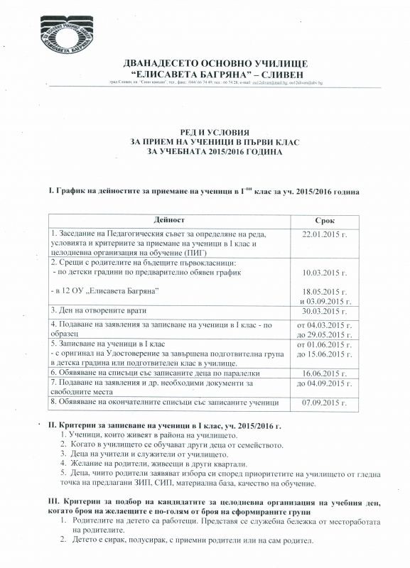 Уведомяваме Ви, че от 04.03.2015 г. 12 ОУ "Елисавета Багряна" - град Сливен започва прием на документи за записване на ученици в първи клас за учебната 2015/2016 година.