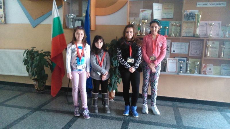 Поздравления за Диляна Веселинова Василева - ІV "Б" клас, Елена Карамфилова Черчеланова - ІV "А" клас, Наталия Галинова Йоргова - ІV"Б"клас, Йоанна Савова Стефанова - ІV"А" клас, които се представиха отлично в областен кръг на Националната олимпиада "Знам и мога" за ІV клас.