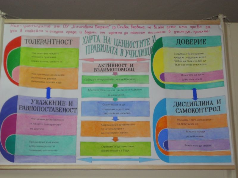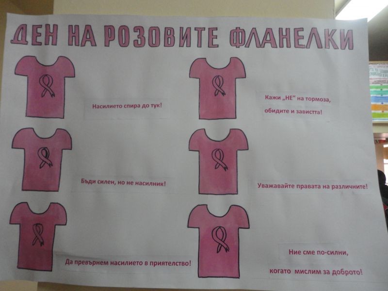 На 25.02.2015 г. в 9.30 часа /в голямото междучасие/ учениците и учителите от ОУ „Елисавета Багряна” гр. Сливен отбелязаха Световния ден за противодействие на тормоза в училище със зумба танци във форума на училището. Учениците се облякоха с розови фланелки и поставиха розови панделки с текст: „Заедно срещу тормоза“. Децата изготвиха „Харта на ценностите в училище” и постер в подкрепа на инициативата.