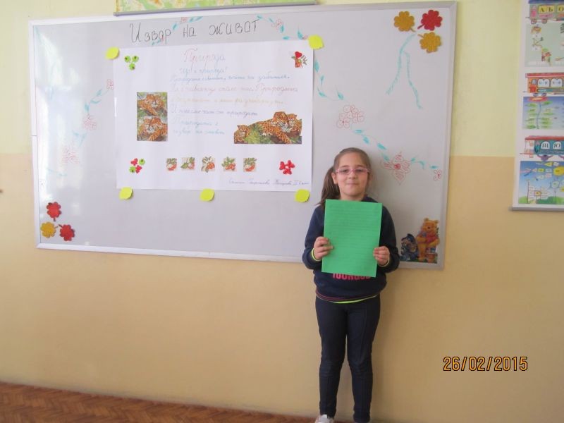 Така започна днес второкласничката Симона Качарова, която ни пренесе в един приказно красив свят, а именно този на природата. Като един истински учен, тя подплати своето представяне с прекрасно изработено табло.