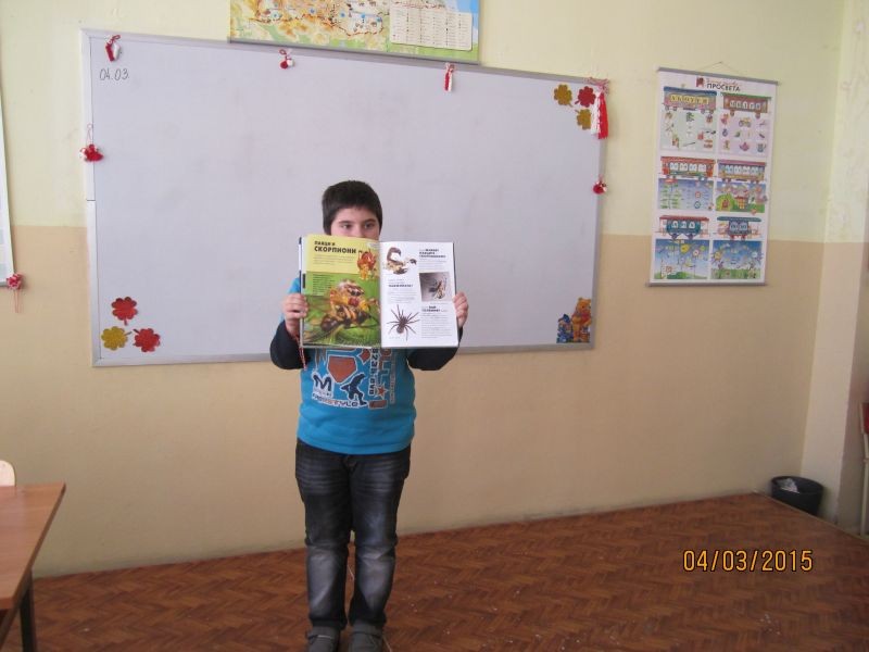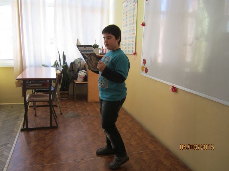Радостин Георгиев от втори клас ни запозна с най-интересните представители от света на влечугите. С увлекателния си разказ ни потопи в света на необятното и вълнуващото. Провокира своите съученици с интересни и забавни въпроси, чийто отговори децата откриха в представените любопитни факти, великолепни фотоси и илюстрации.