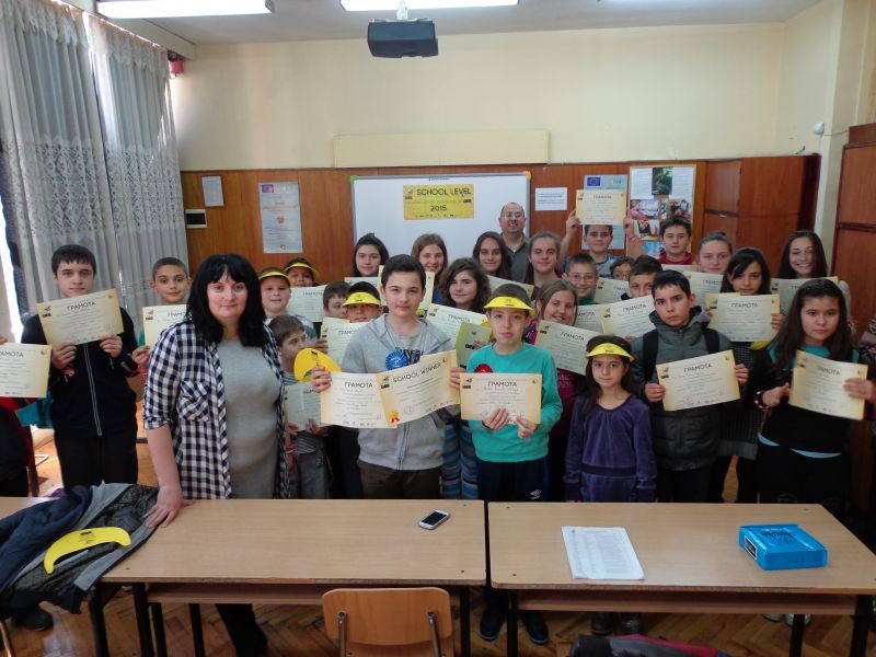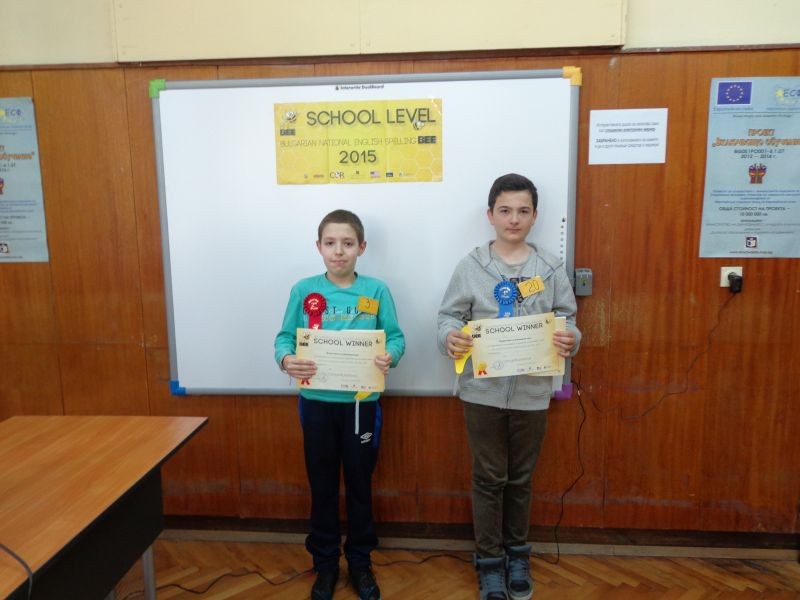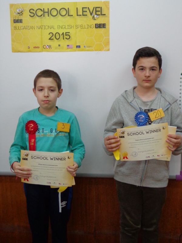 Георги Георгиев Кръстев- ученик от 6 "А" клас и Живко Атанасов Железчев- ученик от 7 "Б" клас се класираха на първо място и второ място в училищното Spelling Bee състезание на СОУ ''Йордан Йовков", град Сливен, което се проведе на 4.03.2015 година. В надпреварата участваха 30 деца, които се състезаваха в 3 кръга. Думата beam донесе победата на шестокласника Георги Георгиев Кръстев, който отнесе у дома грамотата-победител за втора поредна година.