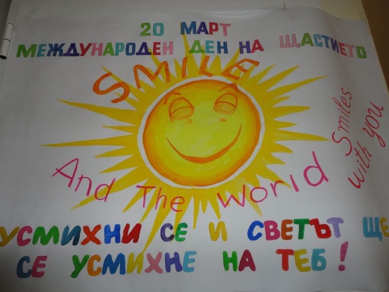 С голямо желание учители и ученици при ОУ „Елисавета Багряна” подкрепиха международната кампания. Те отбелязаха празника с народни и Зумба – финтес танци. По инициатива на Ученическия съвет при училището беше изготвено табло, изразяващо щастието според децата и послание: „Усмихни се и светът ще се усмихне на теб”. Учениците от седми клас написаха прекрасни есета на тема: „Какво за мен е щастието?” и „Щастлив ли е съвременният човек?”.