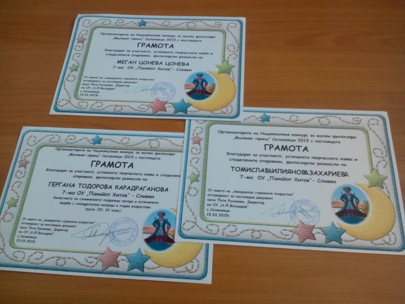 Учениците от VII ОУ"Панайот Хитов" град Сливен Томислава Илиянова Захариева от VII а клас , Меган Цонева Цонева от III б клас и Гергана Тодорова Карадраганова от IV а клас получиха грамоти за участие в Национален конкурс "Малкият принц" , организиран от ОУ"Н.Й.Вапцаров" село Селановци, община Оряхово.