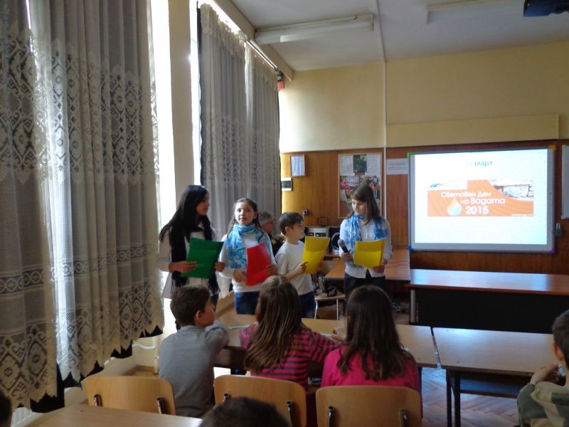 На 22 март ООН отбелязва Световния ден на водата. На него беше посветена и представителната изява на клуб „Светът около нас” по проект УСПЕХ, проведена на 21.03. в мултимедийния кабинет на училището. Участниците в клуба запознаха своите съученици с историята и значимостта на този ден. Припомниха, че качеството на живота зависи от качеството на водата, представиха любопитни факти, свързани с използването и нейното приложение. Представиха данни, свързани с недостига и замърсяването на водата по света . Апелираха за по-разумно използване. Оживление предизвика проведената викторина, в която позналите верния отговор получиха най-подходящия подарък – бутилка минерална вода. За всеки от гостите имаше и „водно послание” – известна мисъл, поговорка или послание, посветени на ценния природен дар.
