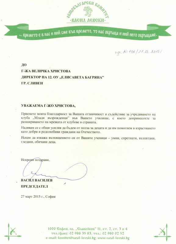 Господин Васил Василев - председател на Общобългарски комитет "Васил Левски" изказа своята благодарност за създаването на клуб "Млади възрожденци" в ОУ "Елисавета Багряна" и изрази възхищението си от членовете на клуба.