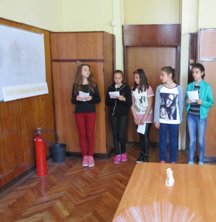 На 27.04.2015 г. шестокласници представиха пред свои съученици от пети и шести клас интересни факти, свързани със светлината. Заедно решаваха кръстословица и участваха във викторина на същата тематика. Забавляваха се и с интересни оптични илюзии.