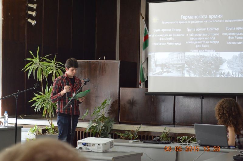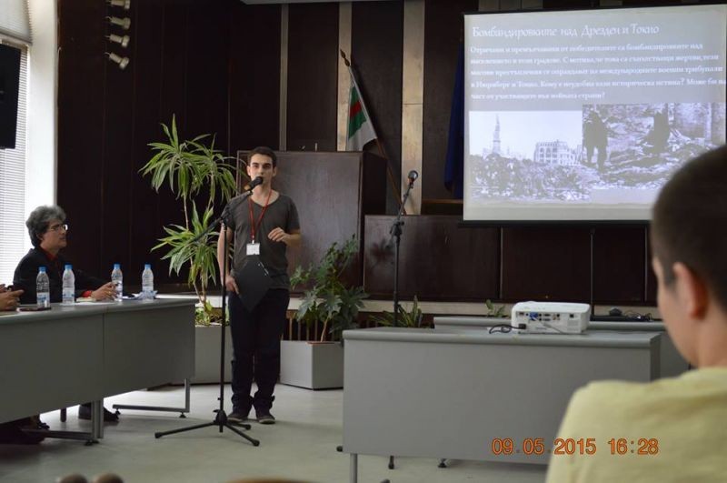 На 9 май в зала „Май” се проведе Кръгла маса на тема: „Да знаем за войната, да пазим мира. 70 години от края на Втората световна война 1945-2015 г.”. Кръглата маса се организира съвместно с Регионалния историческия музей в Сливен, Регионален инспекторат по образование и Съюза на ветераните от войните на България – Сливен. Участие взеха 56 ученици от Сливен и областта, подкрепени от своите учители по история и цивилизация, като бяха представени 47 проекта. Научен ръководител на кръглата маса бе доц. д-р Румяна Маринова–Христиди от Историческия факултет на Софийски университет „Св. Климент Охридски”.