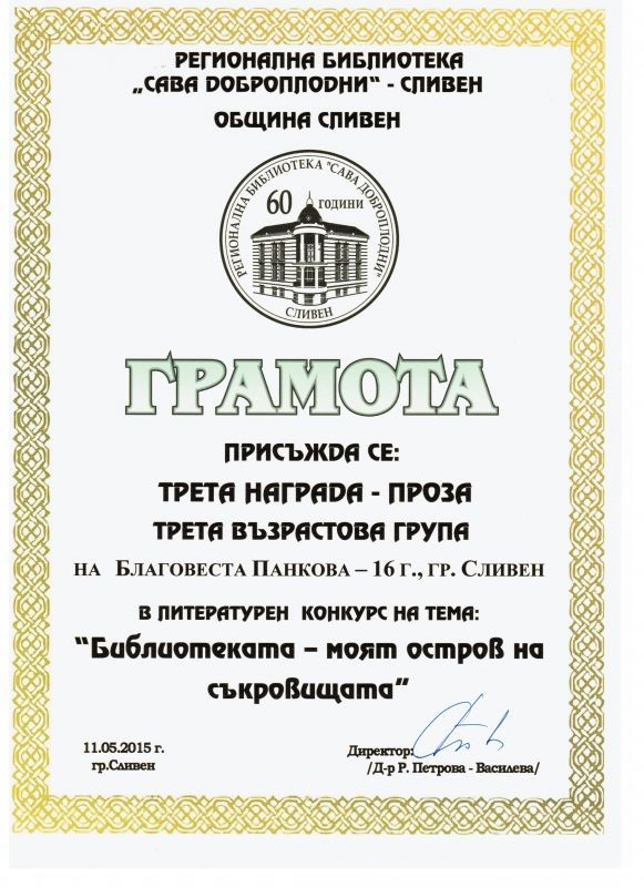 В празничните майски дни учениците от Хуманитарна гимназия „Дамян Дамянов” се включиха в много от инициативите на XVII национален фестивал на детската книга. В последния ден на фестивала бе проведена официалната церемония по награждаването на победителите в конкурсите. Ето и имената на най-добре представилите се наши ученици: