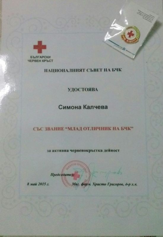 В същия ден по случай Международния ден на Червения кръст и Червения полумесец, Симона беше наградена от председателя на БЧК - Валентин Олимпиев, със значка и грамота „Млад отличник“ за активна червенокръстка работа. Със същото отличие е наградена и Благовеста Панкова, също ученичка в Xа клас.