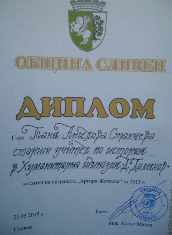 Таня Станчева, старши учител по история и физическо възпитание и спорт в Хуманитарна гимназия „Дамян Дамянов” – Сливен, е носител на наградата „Аргира Жечкова“ за 2015 г. На тържествената церемония в навечерието на 24 май, която се състоя в залата на НТС, кметът на Сливен Кольо Милев връчи наградата на общината на г-жа Станчева . Всяка година тази награда се присъжда на жена-учителка с принос за издигане обществения престиж на учителската професия и доказани високи професионални умения като преподавател и възпитател на младото поколение.