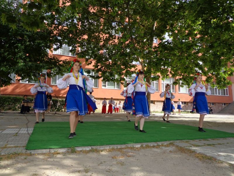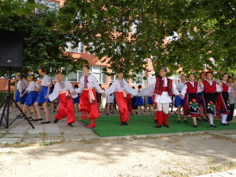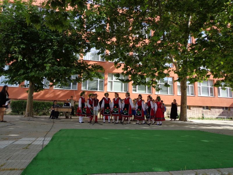 В празнично украсения двор на СОУ "Йордан Йовков" на 24 май отрано звучеше музика.