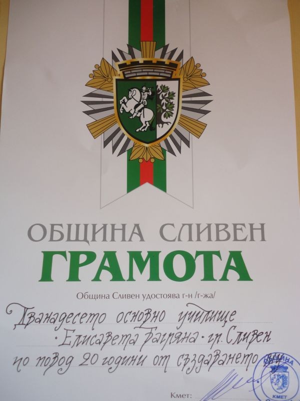 На тържествен концерт в залата на НТС в чест на 24 май - Ден на българската просвета и култура и на славянската писменост, кметът на община Сливен - инж. Кольо Милев връчи почетна грамота и плакет по повод 20 години от създаването на Основно училище "Елисавета Багряна" - Сливен.