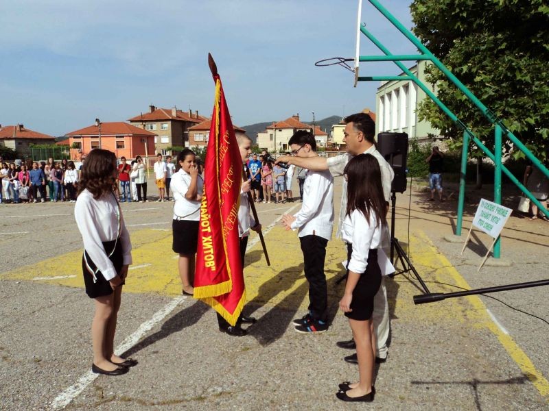 Тържеството в чест на солунските братя Кирил и Методий започна с издигане на националния флаг и внасяне на знамето на училището.
