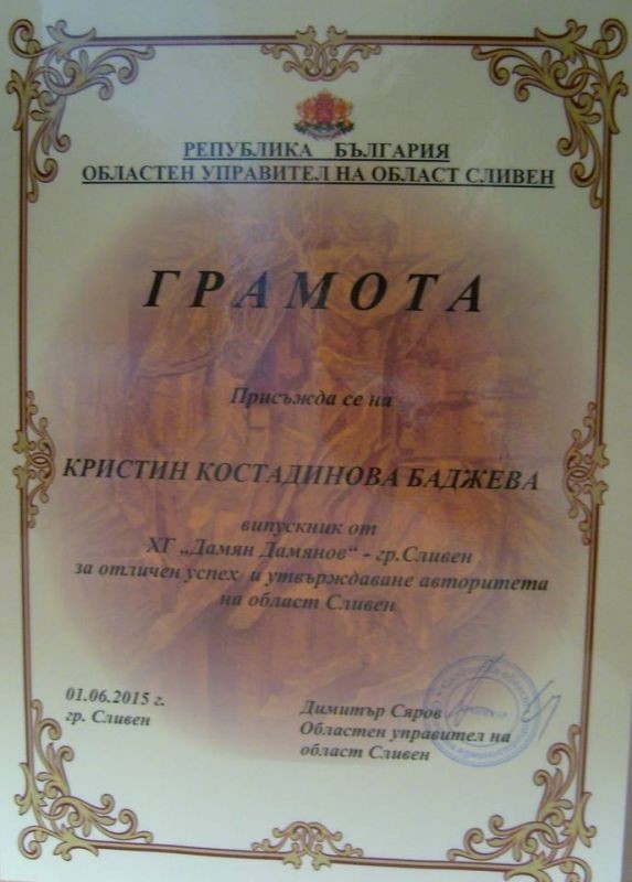 На 1 юни 2015 г. в областна управа – гр. Сливен бяха наградени зрелостниците-пълни отличници на Випуск 2015 г. Сред отличените за отличен успех и утвърждаване авторитета на областта е и първенецът на випуска на Хуманитарна гимназия „Дамян Дамянов” – Сливен - Кристин Баджева. Наградата на Кристин връчи лично заместник-министърът на образованието и науката Ваня Кастрева.
