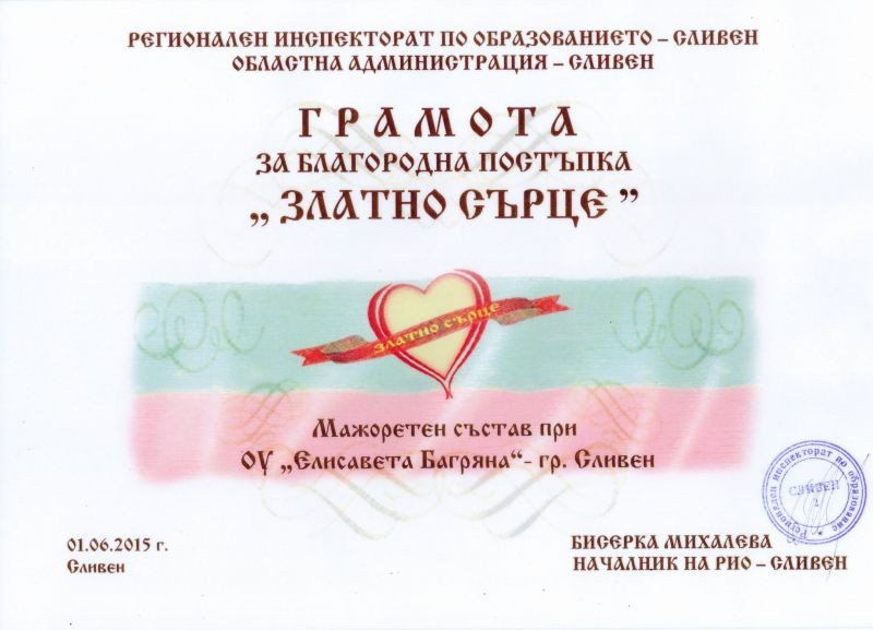 На 01.06.2015г. по повод международния ден на детето се проведе ежегодното тържествено връчване на наградите „Златно сърце", на което бяха отличени мажоретния състав при ОУ „ Елисавета Багряна”, с ръководители Даниела Павлова - хореограф и Тихомир Кондев - корепетитор. Специални гости на тържеството бяха г-жа Ваня Кастрева- заместник- министър на образованието и науката и г-н Димитър Сяров- областен управител на Сливен. На грандиозна церемония в Областна администрация гр. Сливен, г-жа Бисерка Михалева- началник на Регионален инспекторат по образование- гр. Сливен награди мажоретния състав и пожела на децата да извършват още по-благородни дела. С много желание момичетата от мажоретния състав участваха активно в благотворителната инициатива „Да помогнем на Ани” за събирането на средства за тежко заболяване. Децата се включиха и в благотворителната акция „Нашите недоносени деца” и станаха партньори на кампанията за закупуване на животоспасяваща апаратура за неонатологично отделение към МБАЛ „Д-р Иван Селимински” гр. Сливен. Освен чрез своите танци, мажоретките се включиха в инициативата за събиране на пластмасови бутилки и капачки в продължение на шест месеца и ги предаваха на пунктовете за вторични суровини, а получените средства дариха на болницата. Ученичките от мажоретния състав зарадваха възрастните хора от дома, като участваха в благотворителен концерт за Коледа.