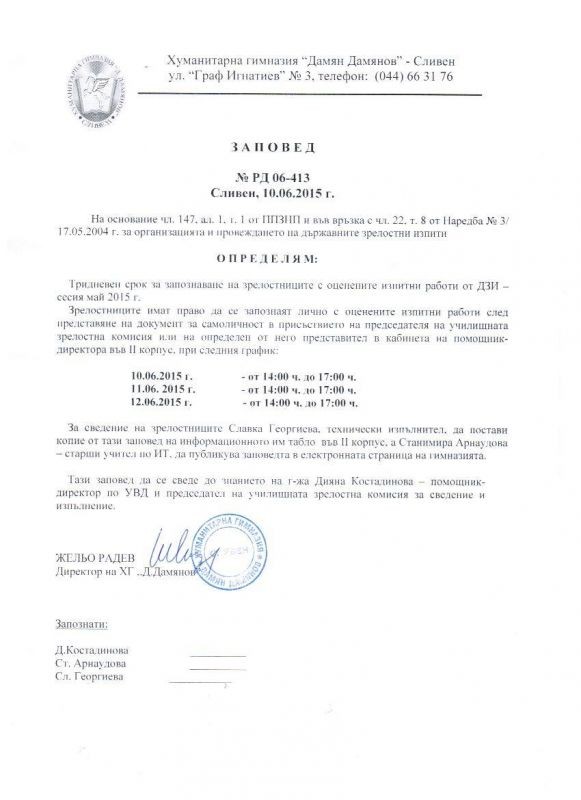 Зрелостниците имат право да се запознаят лично с оценените изпитни работи след представяне на документ за самоличност в присъствието на председателя на училищната зрелостна комисия или на определен от него представител в кабинета на помощник-директора във ІІ корпус, при следния график: