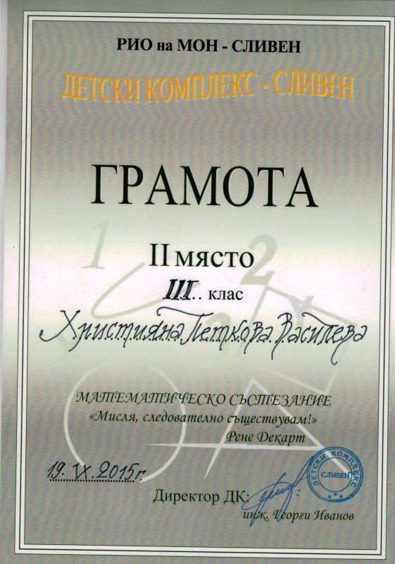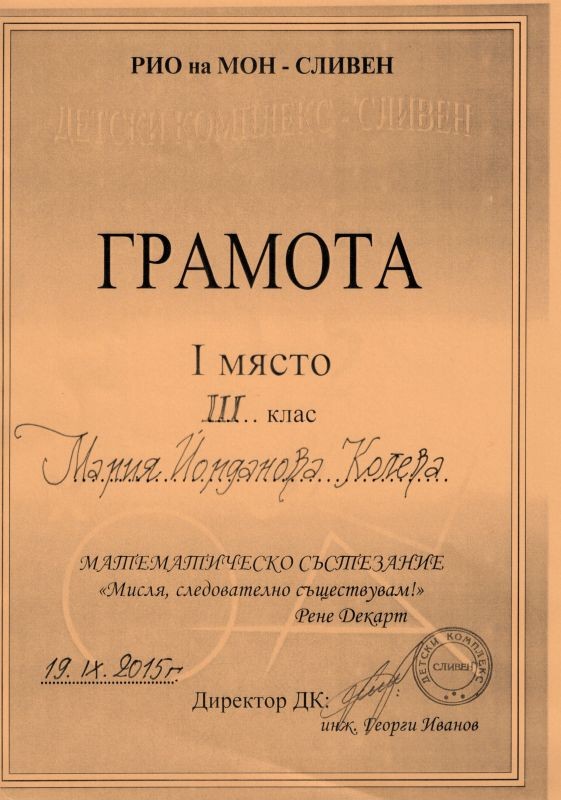 На 19. 09. 2015г. се проведе математическо състезание "Мисля, следователно съществувам"/ Рене Декарт/, организирано от Детски комплекс - гр. Сливен и ПМГ "Добри Чинтулов".