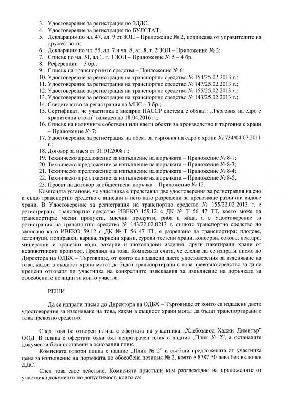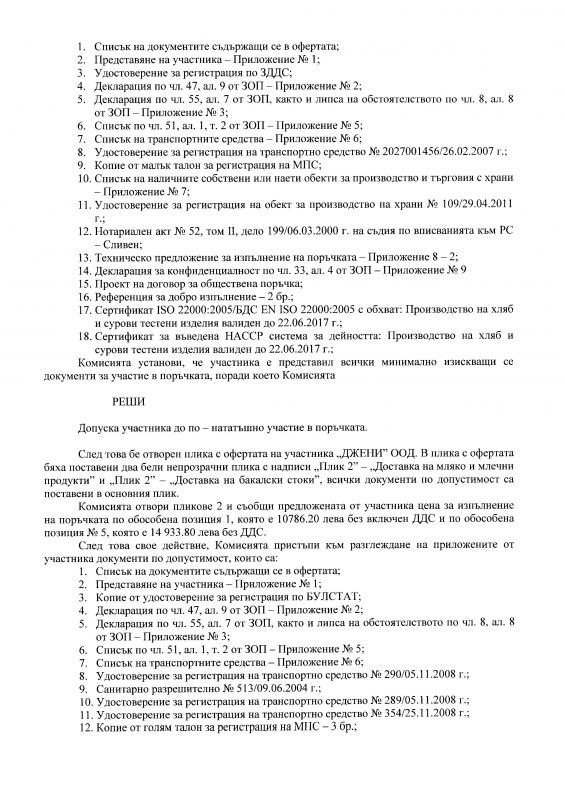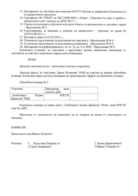 ПРОТОКОЛ №1 /31.08.2015г. от заседание на комисия за избор чрез процедура по ЗОП на доставчик на хранителни продукти по 5 обособени позиции