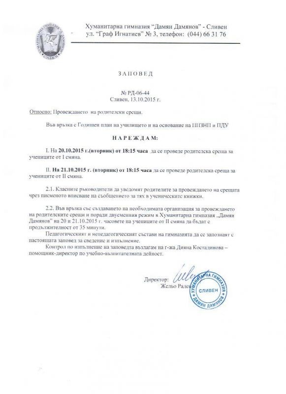 На 20.10.2015 г от 18:15 ч. - за родителите на учениците от 5, 6, 7, 11 и 12 класове;
