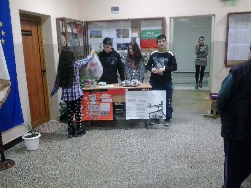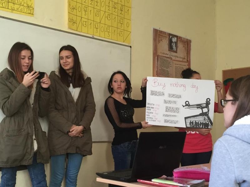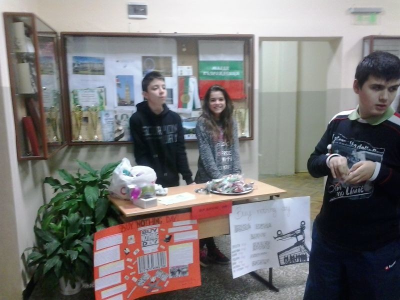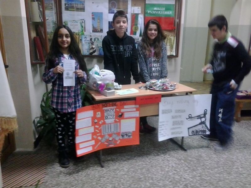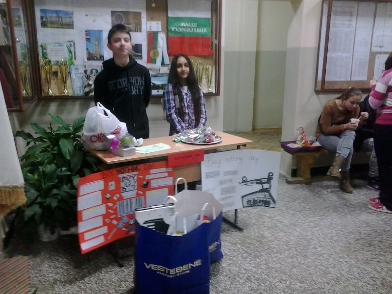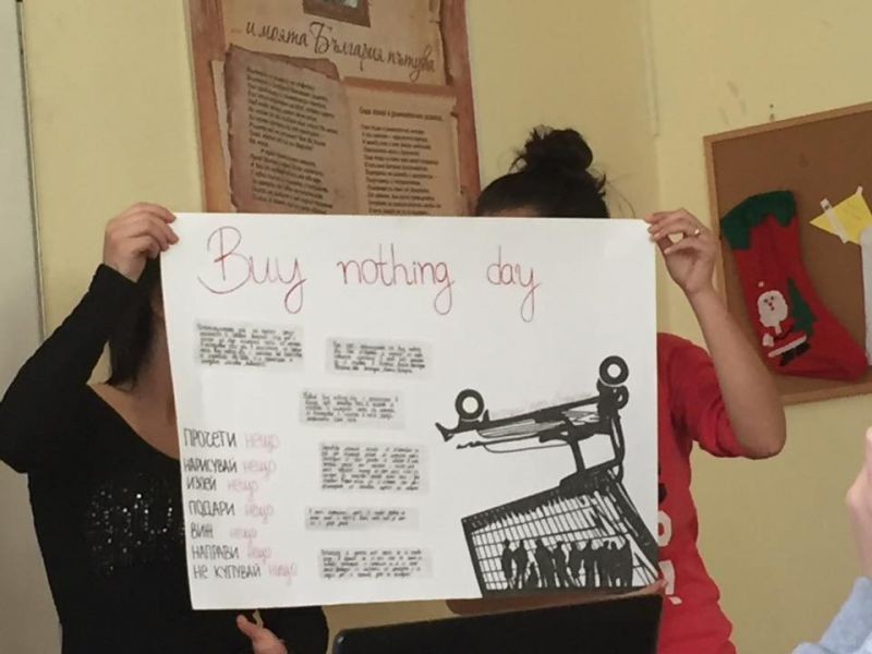 В навечерието на Buy nothing day - 28 ноември, учениците от 6а и 10а клас на Хуманитарна гимназия "Д. Дамянов"- Сливен, отправиха предизвикателство към своите съученици от гимназията - Участвай не като купуваш, а като даряваш! „Имаш играчка, за която вече си пораснал? Имаш книга, която вече си прочел? Имаш в повече моливи, блокче и бои?“
