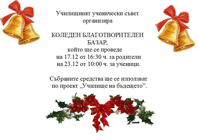 Имаме удоволствието да Ви поканим на Коледен благотворителен базар, който ще се проведе на 17.12.2015 г. от 16.30 часа за родители и на 23.12.2015 г. от 10.00 часа за ученици.
